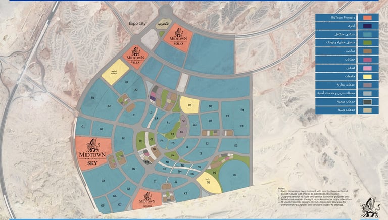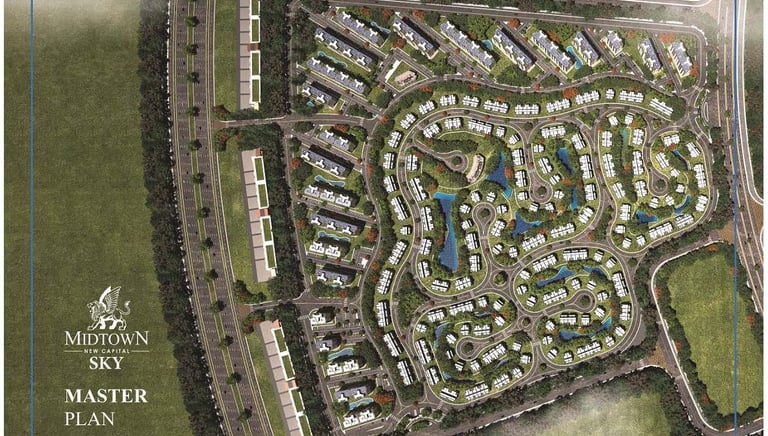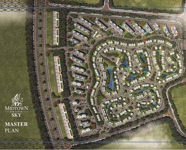 • تم تخصيص نسبة كبيرة من الأرض للمساحات المفتوحة واللاندسكيب والبحيرات الصناعية، بينما تشغل الإنشاءات حوالي 18–20% فقط من المساحة الإجمالية.